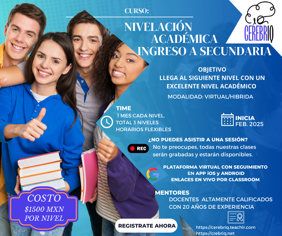 El curso de Nivelación Académica para Ingreso a la Secundaria está diseñado para preparar a los estudiantes que están a punto de ingresar a la secundaria, proporcionando los conocimientos y habilidades fundamentales necesarios para afrontar con éxito los desafíos académicos de este nivel. Este curso cubre una variedad de temas clave que servirán como base sólida en las áreas de matemáticas, lenguaje, ciencias sociales, ciencias naturales y habilidades de estudio.